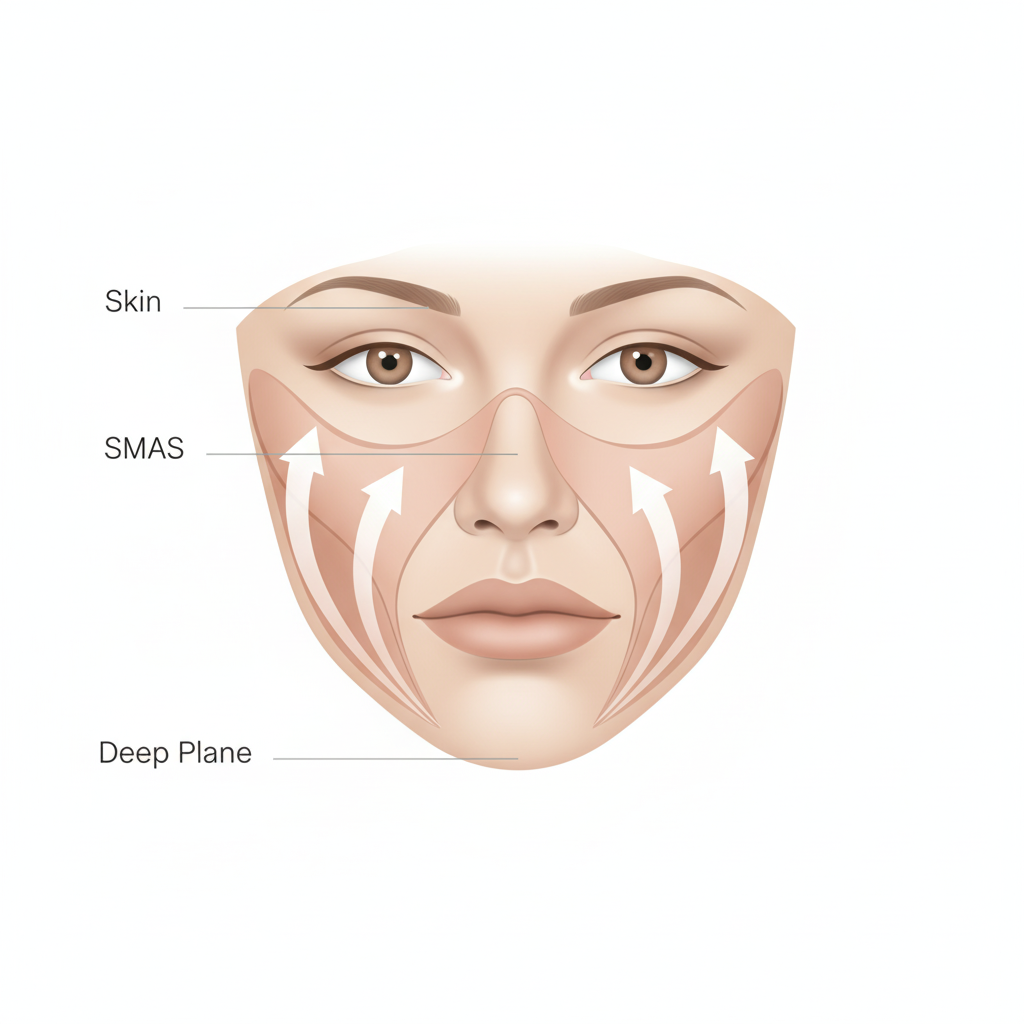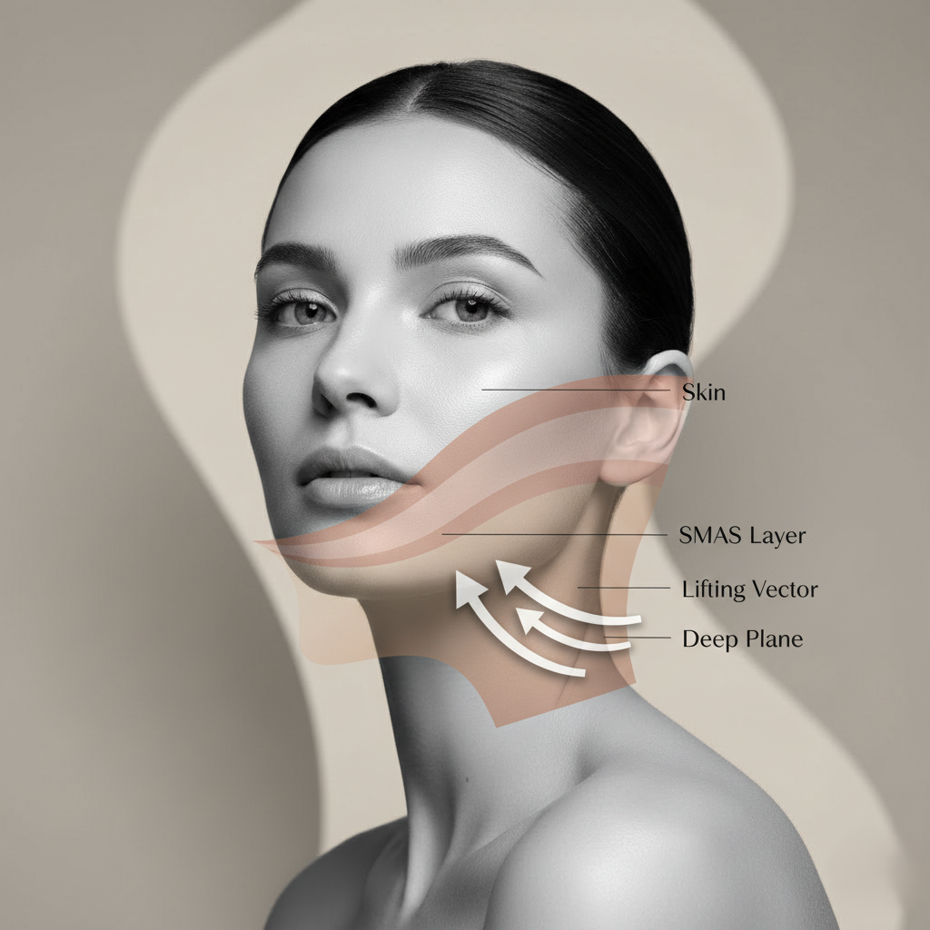 Modern yüz germe ameliyatlarında sadece cilt değil, özellikle SMAS tabakası üzerinde çalışılır. Bu yaklaşım daha doğal, daha uzun süreli ve daha etkili sonuçlar sağlar.